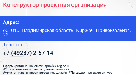 Конструктор, проектная организация по адресу 601010, Владимирская область, Киржач, Привокзальная, 23 в дальнейшем Организация, размещена в следующих категориях: