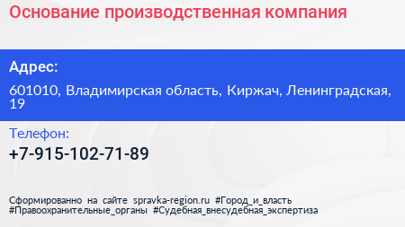 Основание, производственная компания по адресу 601010, Владимирская область, Киржач, Ленинградская, 19 в дальнейшем Организация, размещена в следующих категориях: