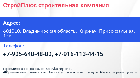 СтройПлюс, строительная компания по адресу 601010, Владимирская область, Киржач, Привокзальная, 15в в дальнейшем Организация, размещена в следующих категориях: