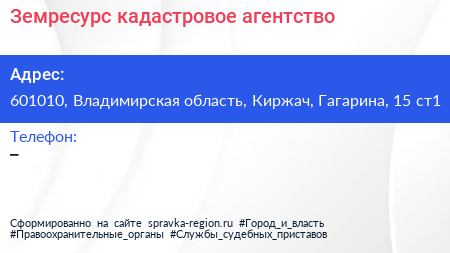 Земресурс, кадастровое агентство по адресу 601010, Владимирская область, Киржач, Гагарина, 15 ст1 в дальнейшем Организация, размещена в следующих категориях: