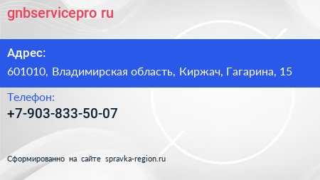 gnbservicepro.ru по адресу 601010, Владимирская область, Киржач, Гагарина, 15 в дальнейшем Организация, размещена в следующих категориях: