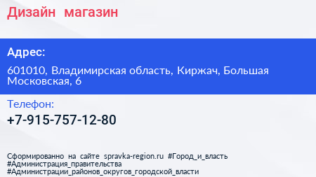 Дизайн+, магазин по адресу 601010, Владимирская область, Киржач, Большая Московская, 6 в дальнейшем Организация, размещена в следующих категориях: