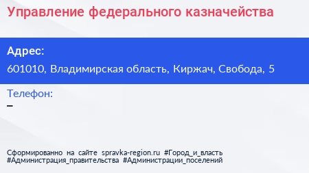 Управление федерального казначейства по адресу 601010, Владимирская область, Киржач, Свобода, 5 в дальнейшем Организация, размещена в следующих категориях: