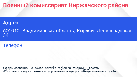 Военный комиссариат Киржачского района по адресу 601010, Владимирская область, Киржач, Ленинградская, 34 в дальнейшем Организация, размещена в следующих категориях: