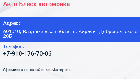 Авто Блеск, автомойка по адресу 601010, Владимирская область, Киржач, Добровольского, 20Б в дальнейшем Организация, размещена в следующих категориях: