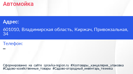 Автомойка по адресу 601010, Владимирская область, Киржач, Привокзальная, 34 в дальнейшем Организация, размещена в следующих категориях: