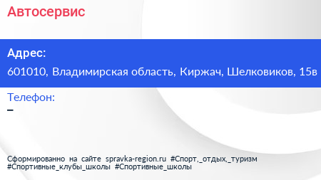 Автосервис по адресу 601010, Владимирская область, Киржач, Шелковиков, 15в в дальнейшем Организация, размещена в следующих категориях: