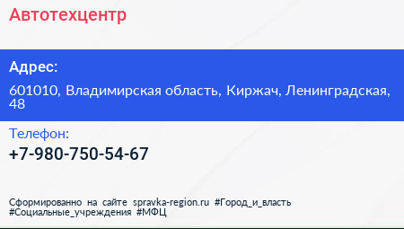 Автотехцентр по адресу 601010, Владимирская область, Киржач, Ленинградская, 48 в дальнейшем Организация, размещена в следующих категориях: