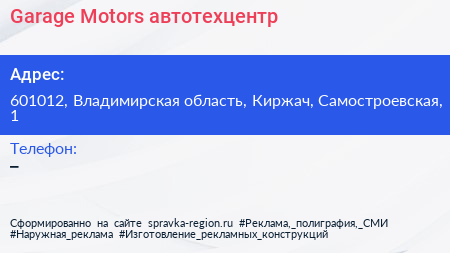 Garage Motors, автотехцентр по адресу 601012, Владимирская область, Киржач, Самостроевская, 1 в дальнейшем Организация, размещена в следующих категориях: