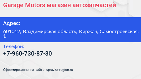 Garage Motors, магазин автозапчастей по адресу 601012, Владимирская область, Киржач, Самостроевская, 1 в дальнейшем Организация, размещена в следующих категориях: