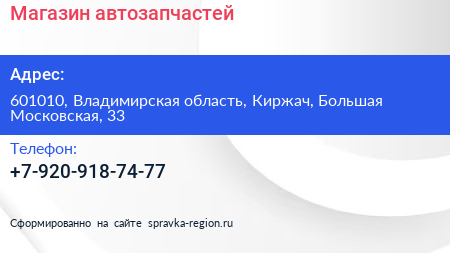 Магазин автозапчастей по адресу 601010, Владимирская область, Киржач, Большая Московская, 33 в дальнейшем Организация, размещена в следующих категориях: