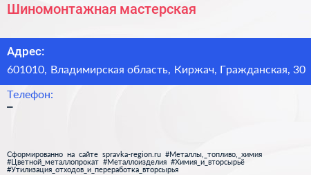 Шиномонтажная мастерская по адресу 601010, Владимирская область, Киржач, Гражданская, 30 в дальнейшем Организация, размещена в следующих категориях: