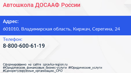 Автошкола, ДОСААФ России по адресу 601010, Владимирская область, Киржач, Серегина, 24 в дальнейшем Организация, размещена в следующих категориях: