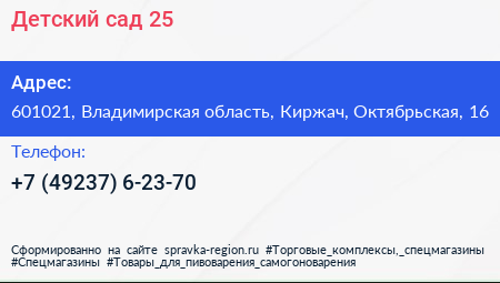 Детский сад №25 по адресу 601021, Владимирская область, Киржач, Октябрьская, 16 в дальнейшем Организация, размещена в следующих категориях: