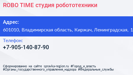 ROBO-TIME, студия робототехники по адресу 601010, Владимирская область, Киржач, Ленинградская, 1 в дальнейшем Организация, размещена в следующих категориях: