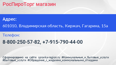 РосПироТорг, магазин по адресу 601010, Владимирская область, Киржач, Гагарина, 15а в дальнейшем Организация, размещена в следующих категориях: