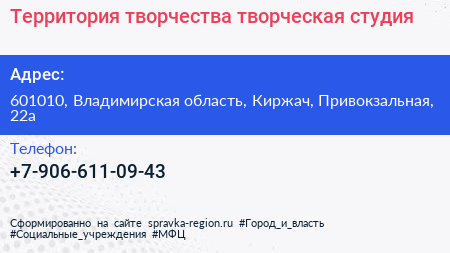 Территория творчества, творческaя студия по адресу 601010, Владимирская область, Киржач, Привокзальная, 22а в дальнейшем Организация, размещена в следующих категориях: