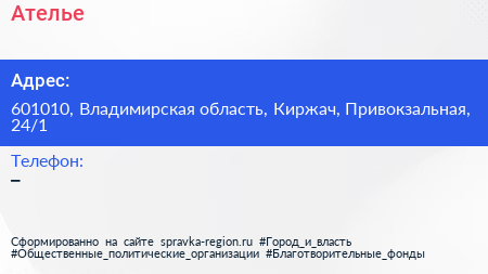 Ателье по адресу 601010, Владимирская область, Киржач, Привокзальная, 24/1 в дальнейшем Организация, размещена в следующих категориях: