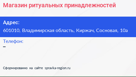 Магазин ритуальных принадлежностей по адресу 601010, Владимирская область, Киржач, Сосновая, 10а в дальнейшем Организация, размещена в следующих категориях: