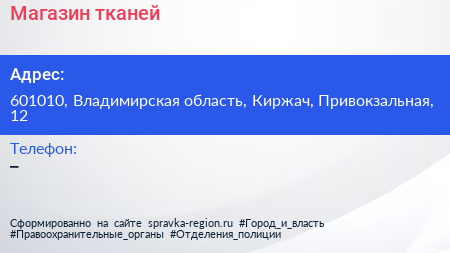 Магазин тканей по адресу 601010, Владимирская область, Киржач, Привокзальная, 12 в дальнейшем Организация, размещена в следующих категориях: