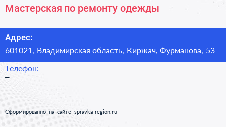 Мастерская по ремонту одежды по адресу 601021, Владимирская область, Киржач, Фурманова, 53 в дальнейшем Организация, размещена в следующих категориях: