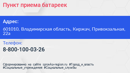 Пункт приема батареек по адресу 601010, Владимирская область, Киржач, Привокзальная, 22а в дальнейшем Организация, размещена в следующих категориях: