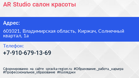 AR-Studio, салон красоты по адресу 601021, Владимирская область, Киржач, Солнечный квартал, 1а в дальнейшем Организация, размещена в следующих категориях: