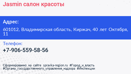Jasmin, салон красоты по адресу 601012, Владимирская область, Киржач, 40 лет Октября, 11 в дальнейшем Организация, размещена в следующих категориях: