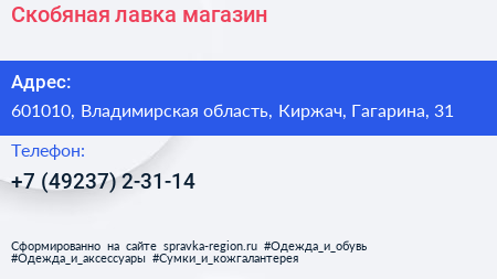 Скобяная лавка, магазин по адресу 601010, Владимирская область, Киржач, Гагарина, 31 в дальнейшем Организация, размещена в следующих категориях: