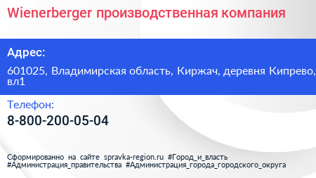 Wienerberger, производственная компания по адресу 601025, Владимирская область, Киржач, деревня Кипрево, вл1 в дальнейшем Организация, размещена в следующих категориях: