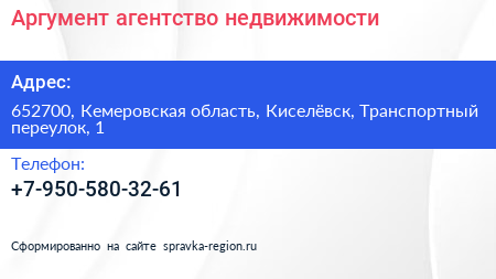 Аргумент, агентство недвижимости по адресу 652700, Кемеровская область, Киселёвск, Транспортный переулок, 1 в дальнейшем Организация, размещена в следующих категориях: