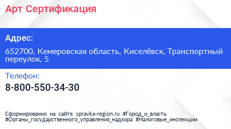 Арт-Сертификация по адресу 652700, Кемеровская область, Киселёвск, Транспортный переулок, 5 в дальнейшем Организация, размещена в следующих категориях:
