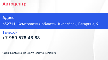 Автоцентр по адресу 652711, Кемеровская область, Киселёвск, Гагарина, 9 в дальнейшем Организация, размещена в следующих категориях: