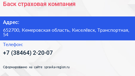 Баск, страховая компания по адресу 652700, Кемеровская область, Киселёвск, Транспортная, 54 в дальнейшем Организация, размещена в следующих категориях: