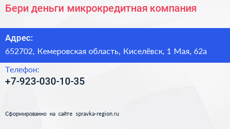 Бери деньги, микрокредитная компания по адресу 652702, Кемеровская область, Киселёвск, 1 Мая, 62а в дальнейшем Организация, размещена в следующих категориях: