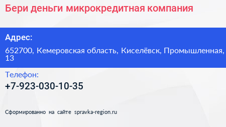 Бери деньги, микрокредитная компания по адресу 652700, Кемеровская область, Киселёвск, Промышленная, 13 в дальнейшем Организация, размещена в следующих категориях: