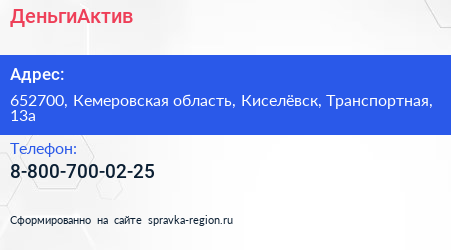 ДеньгиАктив по адресу 652700, Кемеровская область, Киселёвск, Транспортная, 13а в дальнейшем Организация, размещена в следующих категориях: