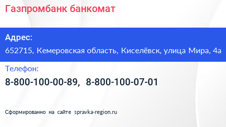 Газпромбанк, банкомат по адресу 652715, Кемеровская область, Киселёвск, улица Мира, 4а в дальнейшем Организация, размещена в следующих категориях:
