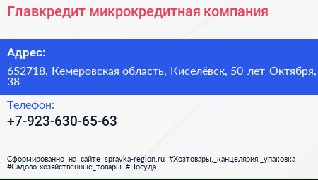Главкредит, микрокредитная компания по адресу 652718, Кемеровская область, Киселёвск, 50 лет Октября, 38 в дальнейшем Организация, размещена в следующих категориях:
