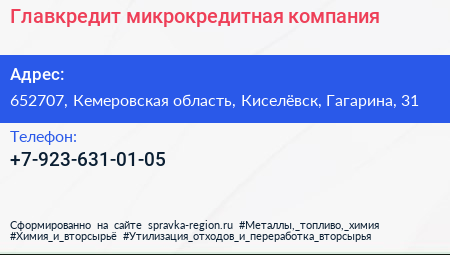 Главкредит, микрокредитная компания по адресу 652707, Кемеровская область, Киселёвск, Гагарина, 31 в дальнейшем Организация, размещена в следующих категориях: