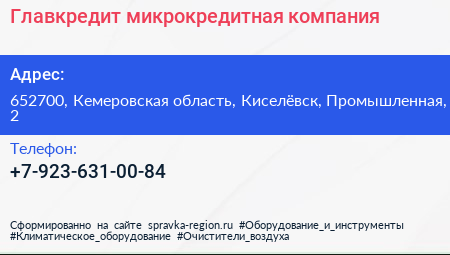 Главкредит, микрокредитная компания по адресу 652700, Кемеровская область, Киселёвск, Промышленная, 2 в дальнейшем Организация, размещена в следующих категориях: