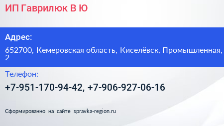 ИП Гаврилюк В.Ю. по адресу 652700, Кемеровская область, Киселёвск, Промышленная, 2 в дальнейшем Организация, размещена в следующих категориях: