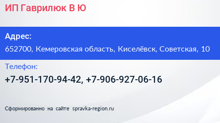 ИП Гаврилюк В.Ю. по адресу 652700, Кемеровская область, Киселёвск, Советская, 10 в дальнейшем Организация, размещена в следующих категориях: