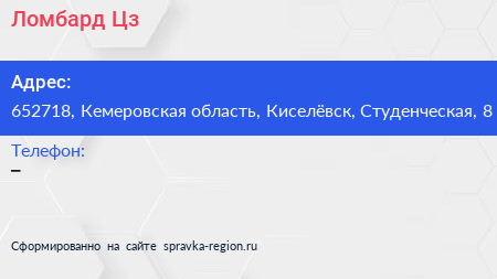Ломбард Цз по адресу 652718, Кемеровская область, Киселёвск, Студенческая, 8 в дальнейшем Организация, размещена в следующих категориях: