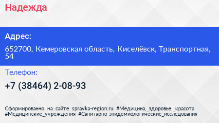 Надежда по адресу 652700, Кемеровская область, Киселёвск, Транспортная, 54 в дальнейшем Организация, размещена в следующих категориях: