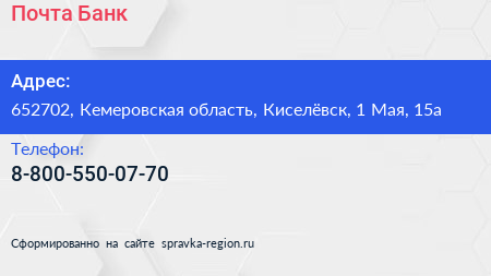 Почта Банк по адресу 652702, Кемеровская область, Киселёвск, 1 Мая, 15а в дальнейшем Организация, размещена в следующих категориях: