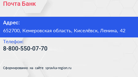 Почта Банк по адресу 652700, Кемеровская область, Киселёвск, Ленина, 42 в дальнейшем Организация, размещена в следующих категориях: