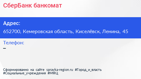 СберБанк, банкомат по адресу 652700, Кемеровская область, Киселёвск, Ленина, 45 в дальнейшем Организация, размещена в следующих категориях: