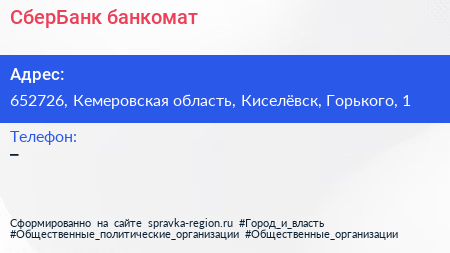 СберБанк, банкомат по адресу 652726, Кемеровская область, Киселёвск, Горького, 1 в дальнейшем Организация, размещена в следующих категориях: