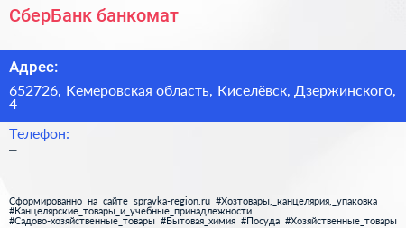 СберБанк, банкомат по адресу 652726, Кемеровская область, Киселёвск, Дзержинского, 4 в дальнейшем Организация, размещена в следующих категориях: